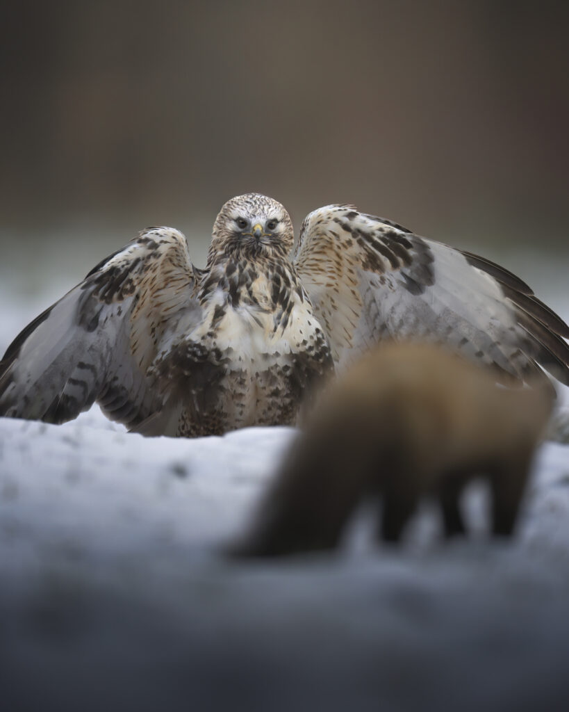- Oggi entreremo nei capanni professionali prima dell’alba, rimanendo al loro interno fino dopo il tramonto per sfruttare ogni momento utile. Il silenzio della foresta ci permetterà di osservare rapaci come Astori e Poiane a distanze ravvicinate. Le postazioni sono riscaldate e dotate di vetri fotografici.